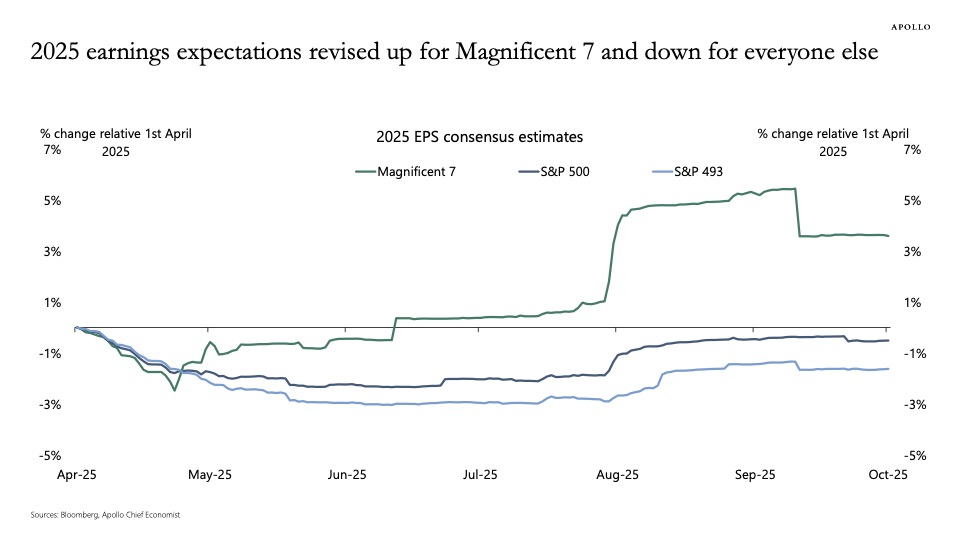 A note last week from chief economist Torsten Slok titled ‘K-Shaped Economy for Firms’ outlined how, since earlier in 2025, earnings expectations have increased for the Magnificent Seven and declined for the S&P 493. The Magnificent 7 are a group of American household names (Apple, Amazon, Google owner Alphabet, Meta, Microsoft, Nvidia, and Tesla) that have doubled down on AI—not only deploying it within their own businesses and bringing new products to market, but also investing in the infrastructure needed to build out the transformative technology.